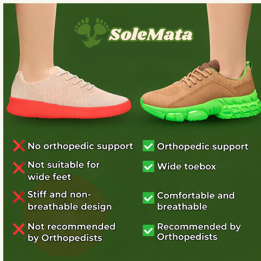 Tired of shoes that feel rigid, lack cushioning, and leave your feet sore by midday? SoleMata™ changes that with ultra-comfortable orthopedic design, a wide toe box, and supportive cushioning that keeps you moving in comfort and style. No more foot pain — just all-day relief you can feel.